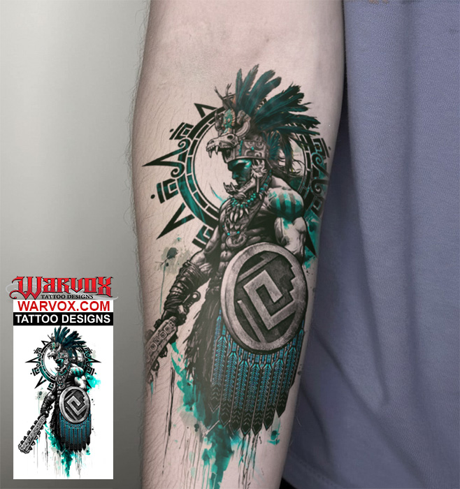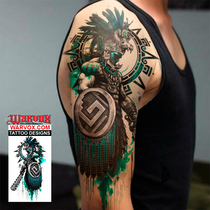 Battle Warrior with Shield and Macuahuitl tattoo design captures the fierce spirit and unbreakable will of an Aztec fighter in the heat of combat. The warrior, poised for battle, grips a Macuahuitl—a deadly obsidian-bladed weapon—and a sturdy shield, symbolizing both offense and defense. This design embodies courage, resilience, and honor, paying homage to the legendary warriors of ancient Mesoamerica. With intricate tribal detailing, dynamic motion, and bold linework, the tattoo conveys raw power and unwavering determination. Perfect for those who embrace strength, heritage, and the warrior’s path, this piece is a timeless tribute to bravery and the indomitable warrior spirit