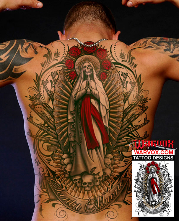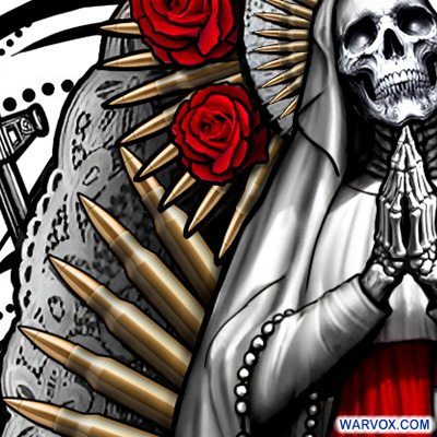 Santa Muerte tattoo design blends sacred symbolism with striking artistry, featuring the skeletal saint adorned with blod red roses (passion and sacrifice), Bullets, reflecting themes of danger, resilience, and divine shielding in harsh environments, The Santa Muerte Design captures the mystique and power of the revered folk saint This tattoo merges devotion with bold imagery, making it a striking tribute to faith, strength, and the mysteries of life and death.
