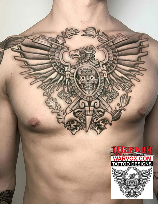 This Stone Aztec Eagle Emblem tattoo design masterfully blends ancient symbolism with a timeless aesthetic, capturing the spirit of a warrior culture in a permanent work of art. Rendered with the textured, with appearance of carved stone, the design depicts the iconic eagle with its wings majestically spread, a direct homage to the founding myth of Tenochtitlan. Every line and geometric pattern is etched with purpose, echoing the intricate reliefs found on Aztec temples, symbolizing strength, courage, and a connection to the sun and the divine. This tattoo is more than just an image; it is a powerful statement piece that serves as a tribute to heritage, resilience, and the soaring power of freedom, all encapsulated in the enduring form of stone.